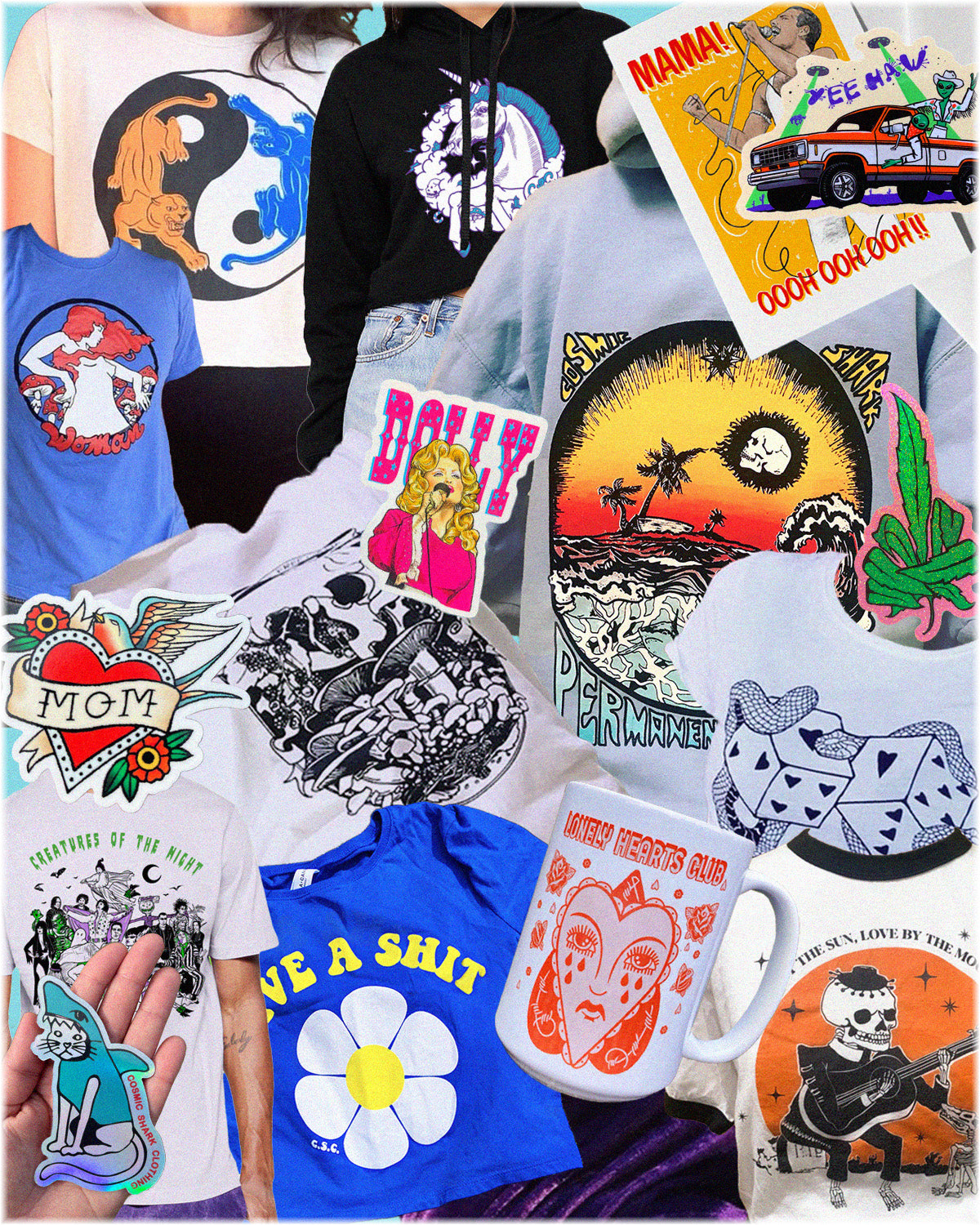 Shop our original designs all hand printed by us! Apparel, mugs, totes, stickers and more!
